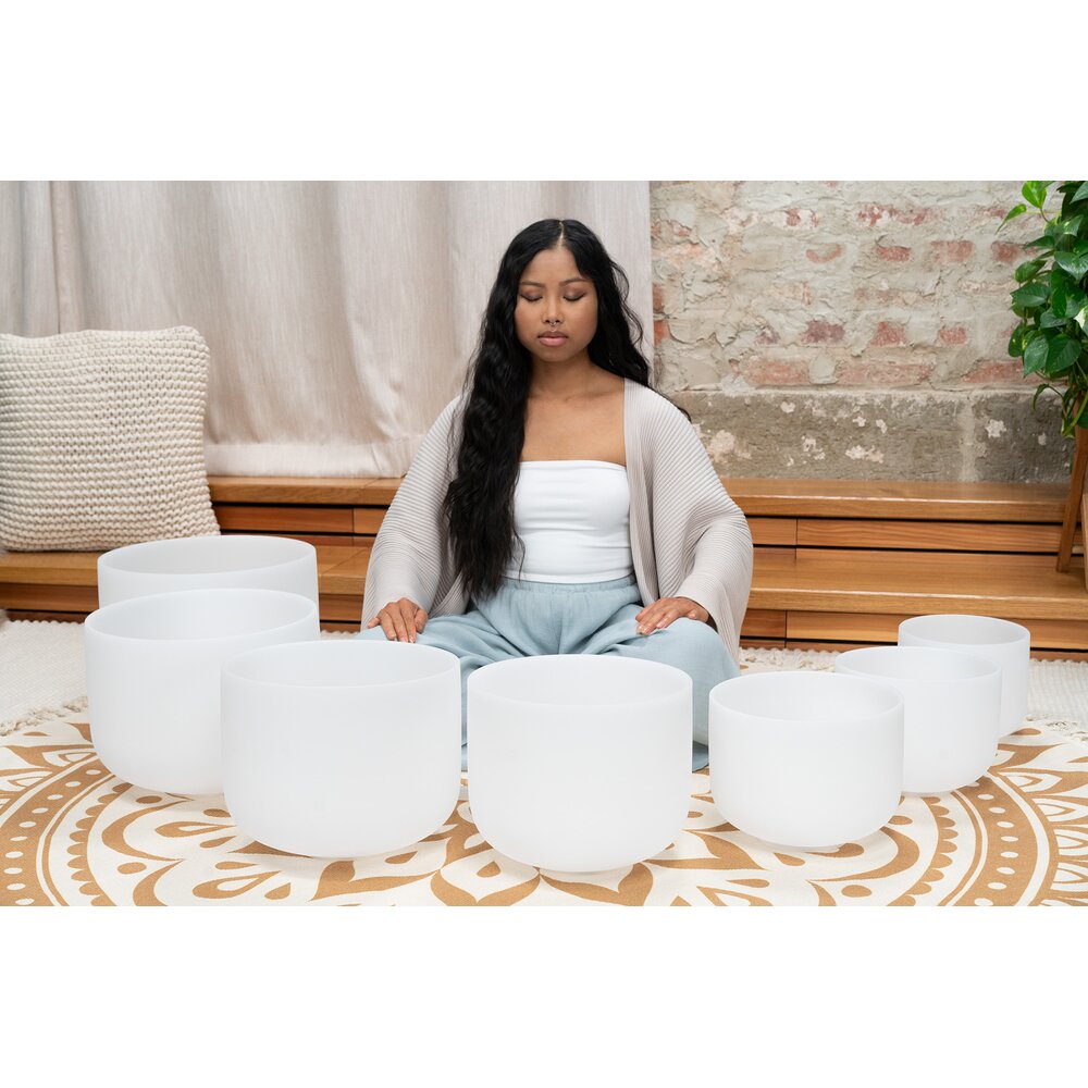 - Chakra set containing 7 crystal singing bowls
