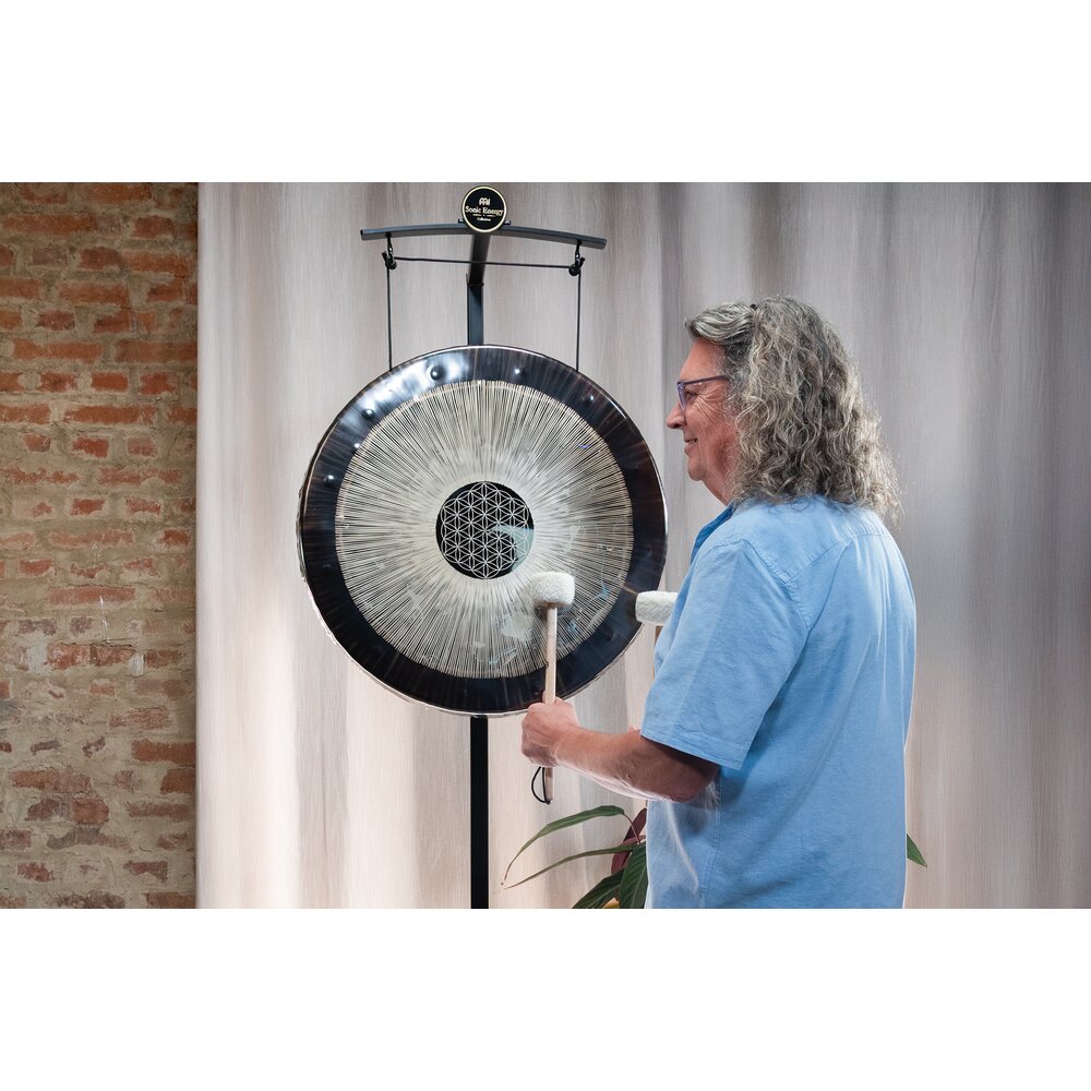 This Flower of Life Soundscape Gong includes a premium travel bag for safe and easy transport, two mallets (MGM1 & MGM2), a Gong Handle (G-HANDLE) for playing freely by hand, and a pair of gloves for careful handling. Tuned to 64 Hz, it offers deep, grounding vibrations that invite the listener into a state of calm and connection.