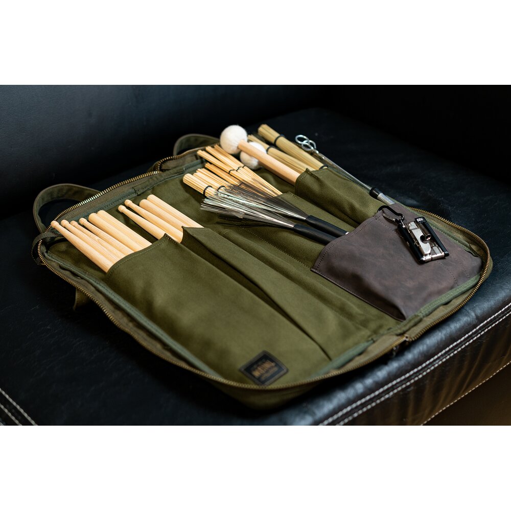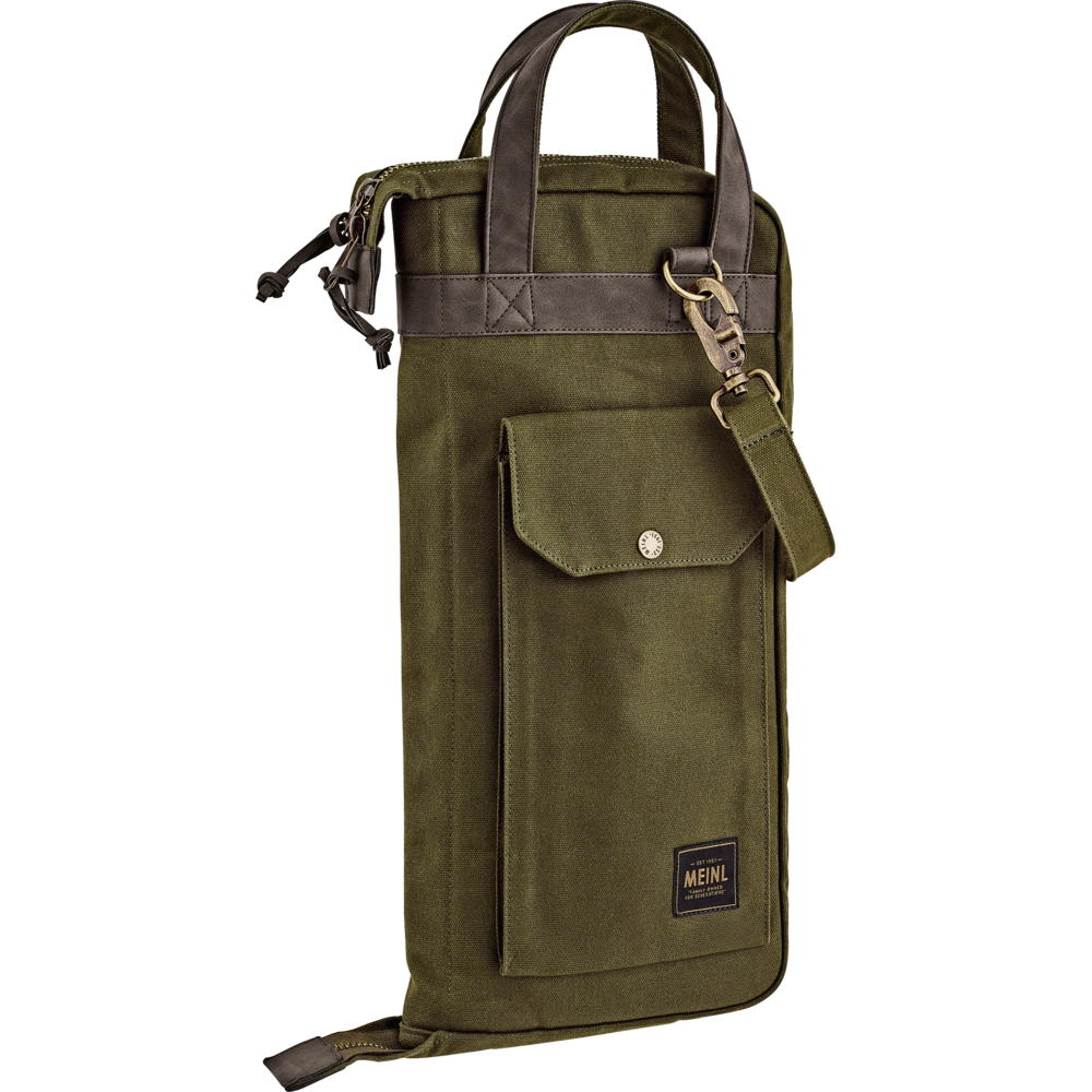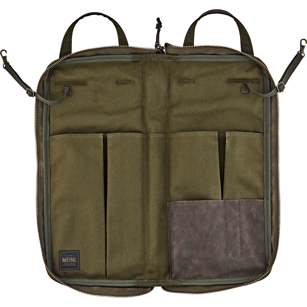 The Meinl Waxed Canvas Collection Drumstick Bag has all the tough useability of a touring bag with classic good looks. Our ultra-durable, heavyweight 24-ounce cotton canvas fabric exterior is finished with an anti-abrasion, water resistant wax coating to maintain a lifetime of use while aging beautifully. Inside the main compartment are five pockets to organize a large number of drumsticks, brushes, rods and mallets. Plus, there are three different sized accessory pockets to accommodate smaller parts or sound effects. This drumstick bag comes equipped with length adjustable floor tom hooks and straps to suspend it in an open position. For quick access storage, the large exterior pocket is sized for common accessories or tools, and it snaps shut to secure your items. An adjustable/removable shoulder strap and reinforced leatherette handle let you comfortably transport this bag to the gig or studio. Getting into the bag is easy with the large zipper pull tabs that come with long leatherette draws. The Meinl Waxed Canvas Collection Bags are designed for an understated and timeless style while being as practical as ever for any type of traveling drummer. Available in Black, Forest Green or Vintage Khaki.
