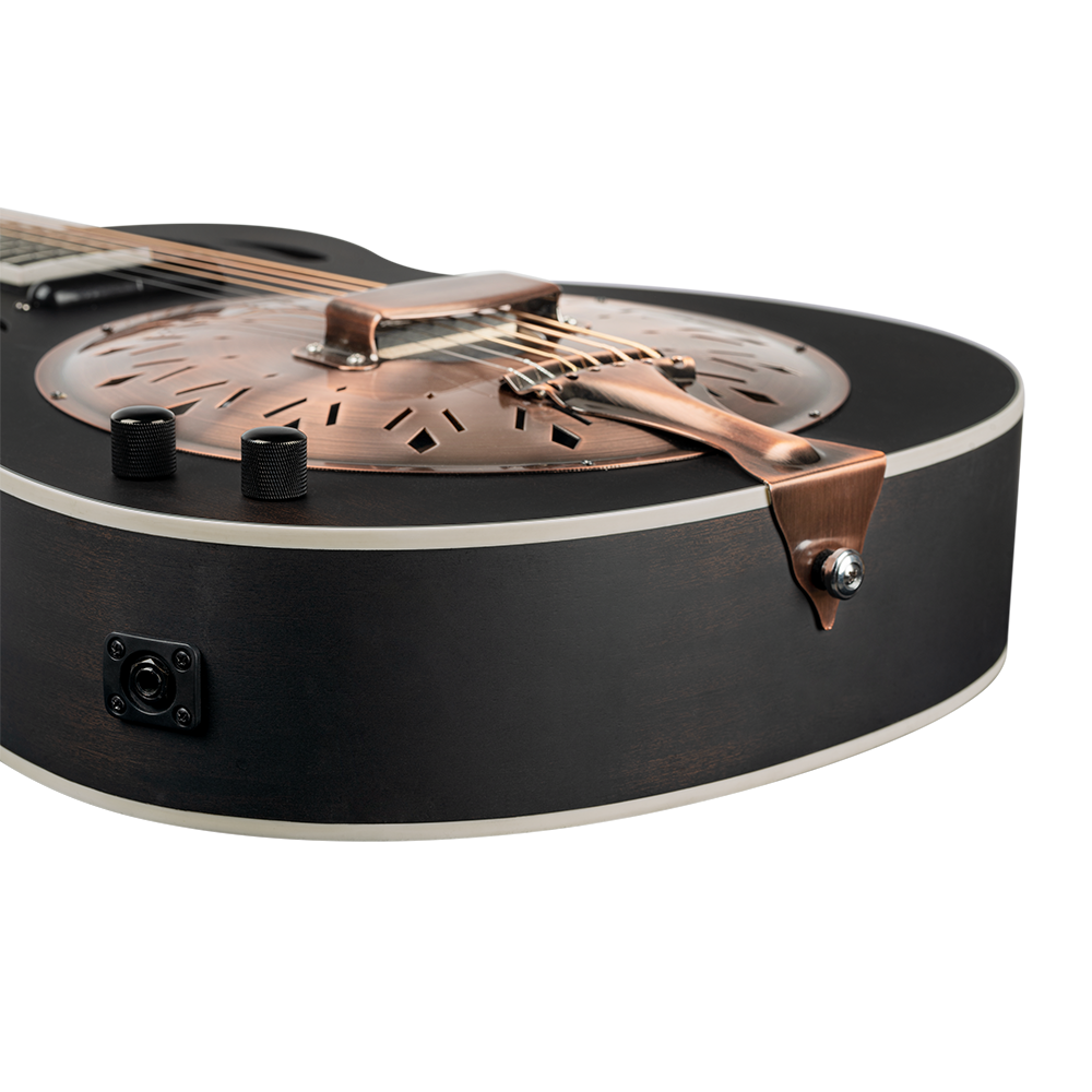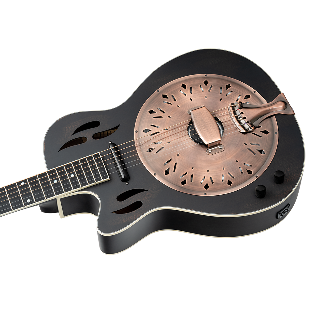 A distinctive cone resonator that is integrated into the resonator guitars gives the characteristic overtone-rich twang.