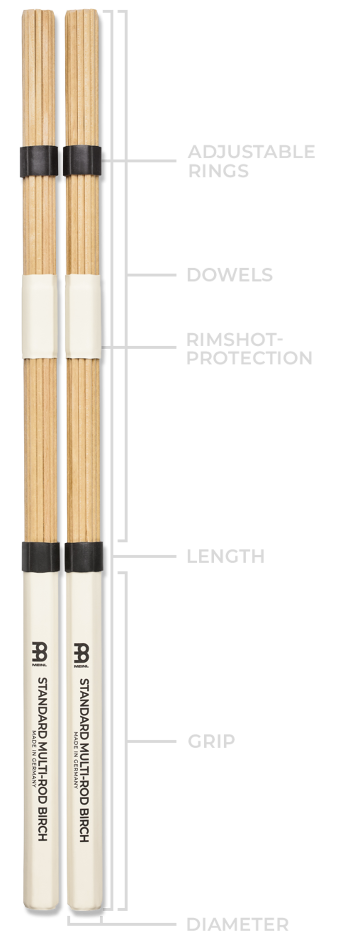 All Meinl Multi-Rods comes with one or two adjustable rings to change the amount of dowel spread. Move these rings to the top end of the stick, the sound gets more focused with greater attack. Move them towards the butt end, and the sound gets softer and has less attack.