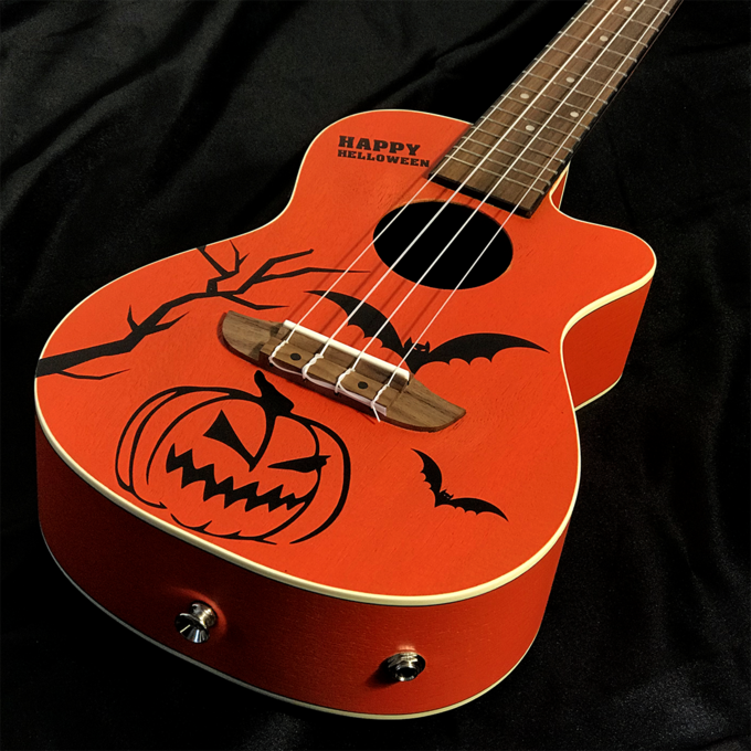 An Ortega acoustic-electric ukulele RUPUKI-CE and an Ortega acoustic ukulele RUPUKI. Both ukuleles have a custom Helloween design and are exclusively available in this giveaway.